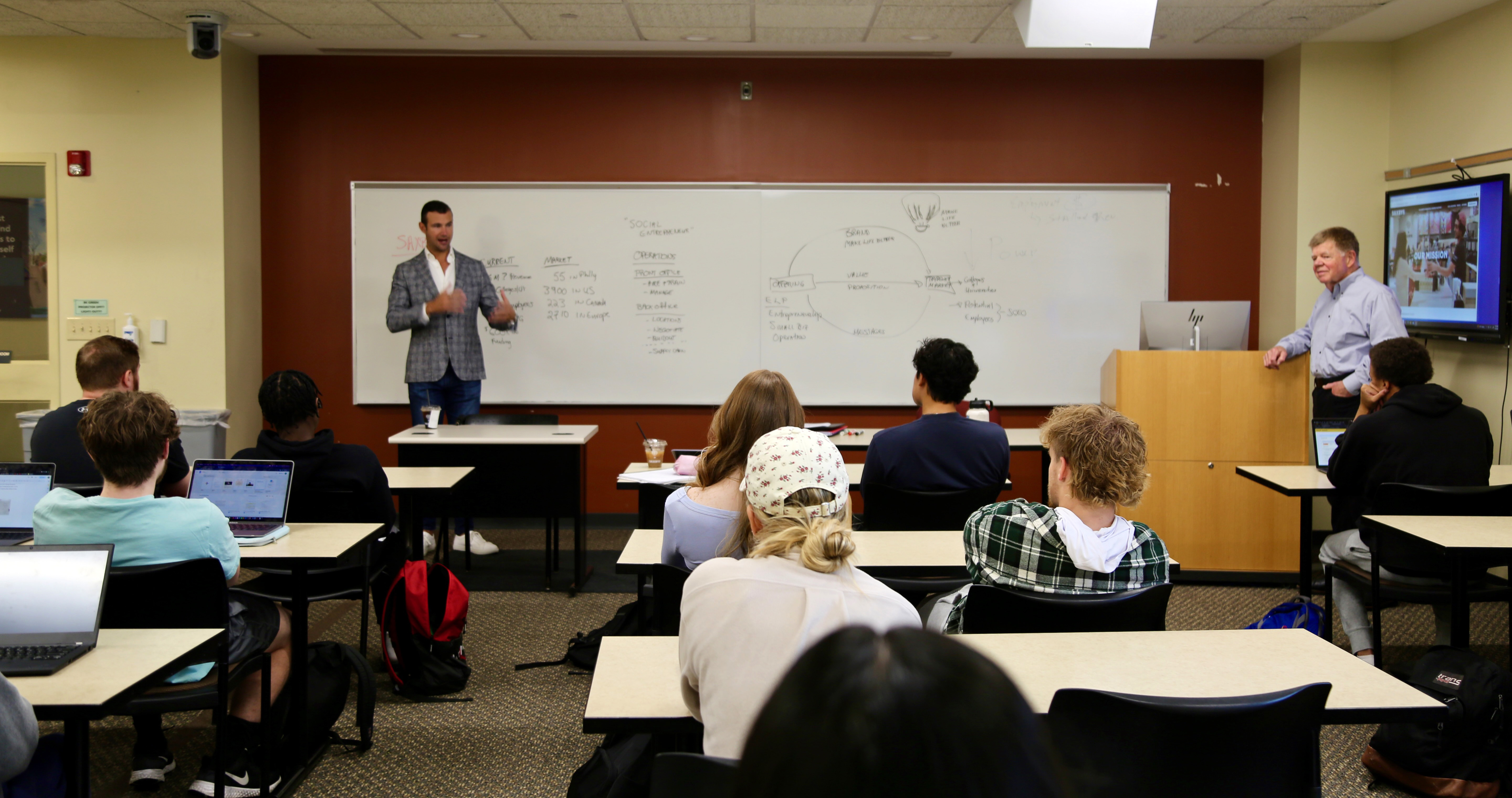 买球app’s students in Dr. Don Goeltz’s Principles of Marketing class received valuable advice from visiting Saxbys Founder & CEO Nick Bayer, learning how to harness their entrepreneurial spirit and to rely on their own emotional intelligence and resilience to craft the career of their dreams.